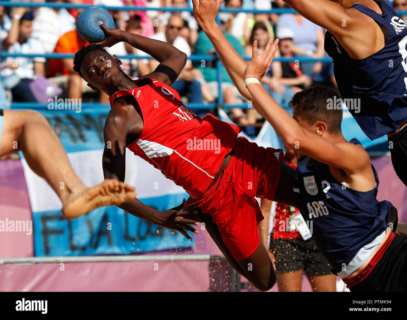 181010 Buenos Aires Oct 10 2018 Xinhua Jean Romain L Of Mauritius Shoots During Beach Handball Men S Preliminary Round Group B Match Between Mauritius And Argentina At The 2018 Summer