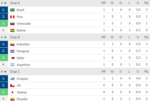 Tiru perkasanya Brasil berikut klasemen lengkap Copa America sementara. Uruguay - 1 Poin. Fae grup setengah jalan.
